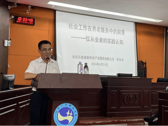 为拓展社工学生视野,培育专业知识素养,6月21日,我院邀请娄底市百善社工综合服务中心主任、娄底百善健康养老产业服务有限公司总经理罗尧清于致远楼202开展了社会工作校企合作讲座。我院社会工作专业老师、21、22级社工全体同学参与本次讲座,讲座由谭景林老师主持。