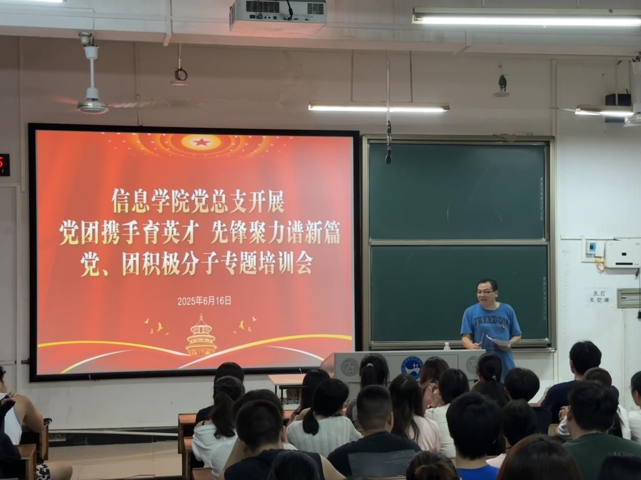 为深入学习贯彻党的教育方针,切实加强党团组织建设,提升党、团积极分子的思想觉悟和实践能力,6月16日晚,信息学院党总支开展了“党团携手育英才 先锋聚力谱新篇”党、团积极分子专题培训会。学院党总支书记刘凤龙参加并作专题培训,党总支副书记朱舒腊主持。