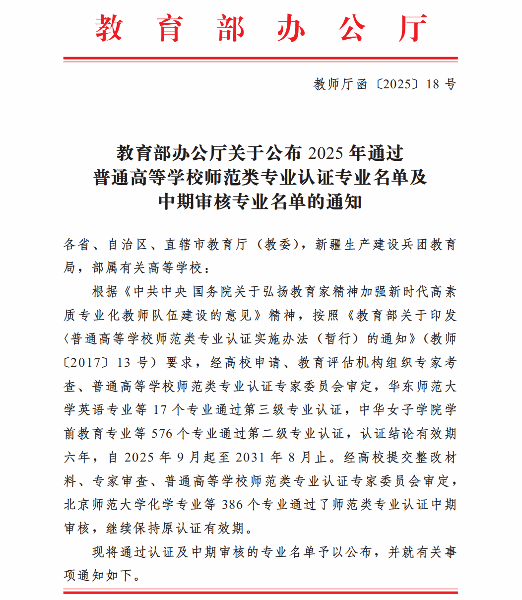 近日,教育部办公厅公布2025年通过普通高等学校师范类专业认证专业名单,开云(中国)数学与应用数学、化学两个专业顺利通过师范类专业第二级认证,认证结论有效期六年,自2025年9月起至2031年8月31日止。