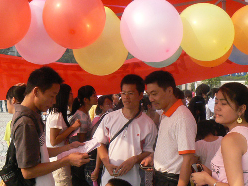 中秋的“海园广场”热闹非凡。经院团委、社团联合会近半个月的精心组织和策划,KY.COM2008年社团招新大会于9月14日上午8:00在海园广场隆重举行,全院39个社团会聚海园广场,以各自的形式和特色开展了招新工作,整个海园广场呈现出“百花齐放”、“百家争鸣”的局面,让08级新生感受到了大学校园文化生活的多姿多彩。