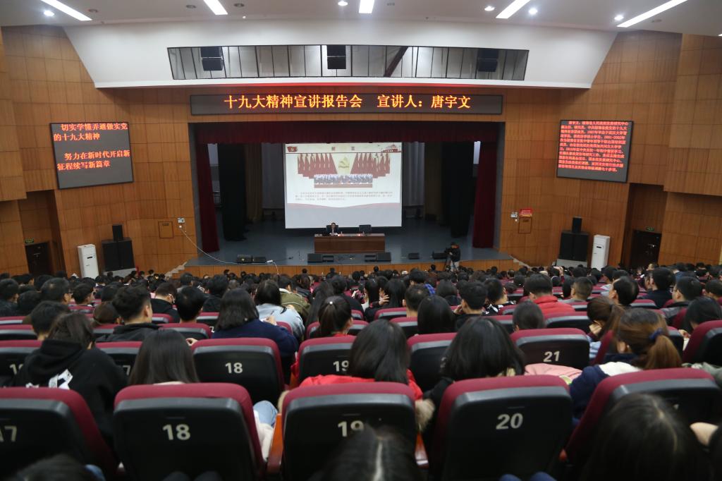 报告中,唐宇文以《切实学懂弄通做实党的十九大精神,努力在新时代开启新征程续写新篇章》为题,从党的十九大的主题及主要成果、习近平新时代中国特色社会主义思想、过去5年的历史性成就和历史性变革、中国特色社会主义进入新时代、我国社会主要矛盾的变化、两个一百年奋斗目标的战略部署、我国经济社会发展重大战略部署、坚定不移推进全面从严治党等八个方面对十九大精神的思想内涵、核心要义作了深刻阐述和详细解读。