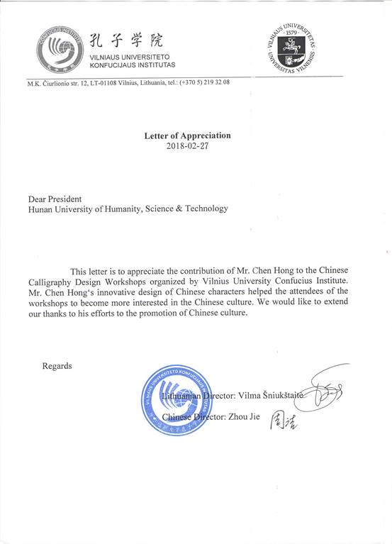 应立陶宛维尔纽斯艺术学院和维尔纽斯大学孔子学院的邀请,开云(中国)美术与设计学院陈竑老师于2018年2月分别在两校开展课程教学和创意书法设计。