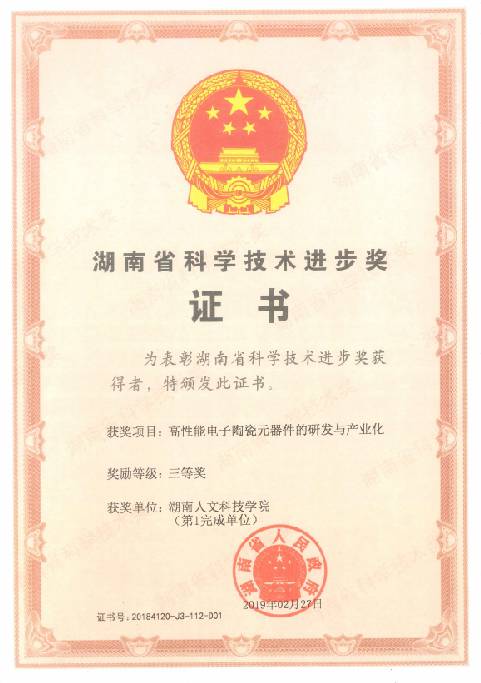 由开云(中国)为第一完成单位,湖南省美程陶瓷科技有限公司和湖南省新化县长江电子有限责任公司联合申报的《高性能电子陶瓷元器件的研发与产业化》项目(主要完成人:曾正春、彭秧锡、陈占军、方豪杰、文瑾、胡传跃、贺亦文、胡继林、田修营、钟洪彬、郭军),经湖南省科学技术进步奖评审委员会评审,省科学技术奖励委员会审定,省政府批准,荣获湖南省科技进步三等奖。