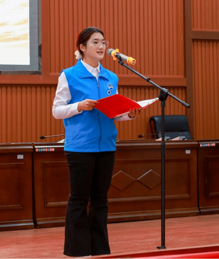 “E路筑梦”社区实践团队志愿者代表廖佳倩上台分享了团队在筹备和实施“四点半课堂”过程中的经历和感悟,并发出将与祖国同行、与人民同心,让青春之火燃燃不息、让青年号角弦歌不辍的铮铮誓言。