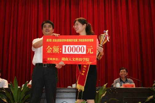 8月31日上午,学校2012年下学期工作会议在体育馆召开。会上,副校长蒋建初宣读了对全国首届高校青年教师教学竞赛二等奖获得者李曾妍的表彰决定,并号召全体教职员工学习李曾妍老师热爱教育、爱岗敬业的精神,钻研业务、潜心教学的精神,勇于开拓、不断创新的精神。柏连阳书记为获奖者颁发了奖杯和奖金。