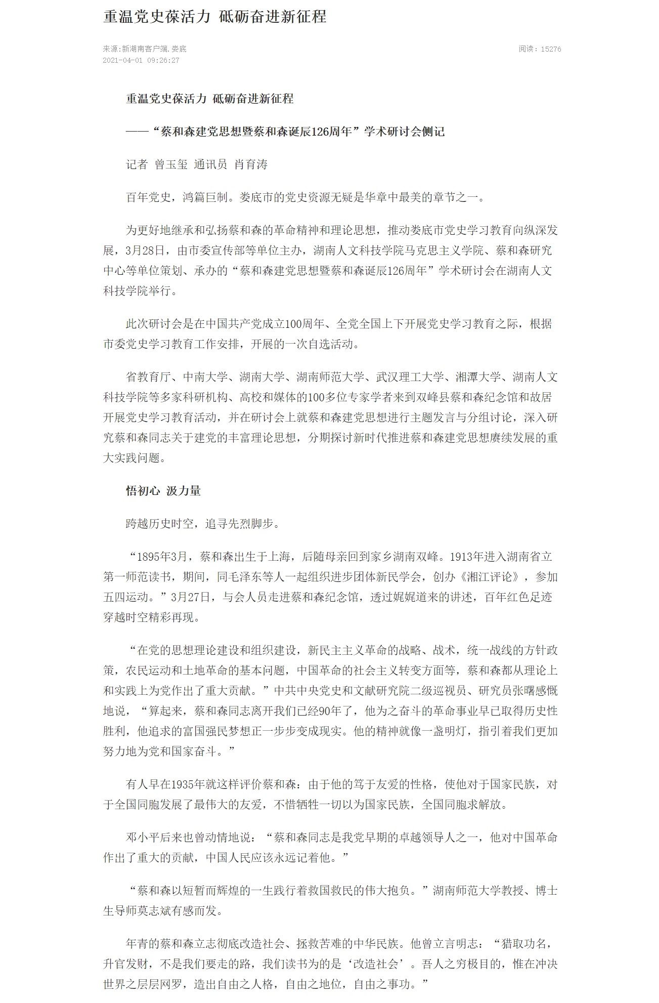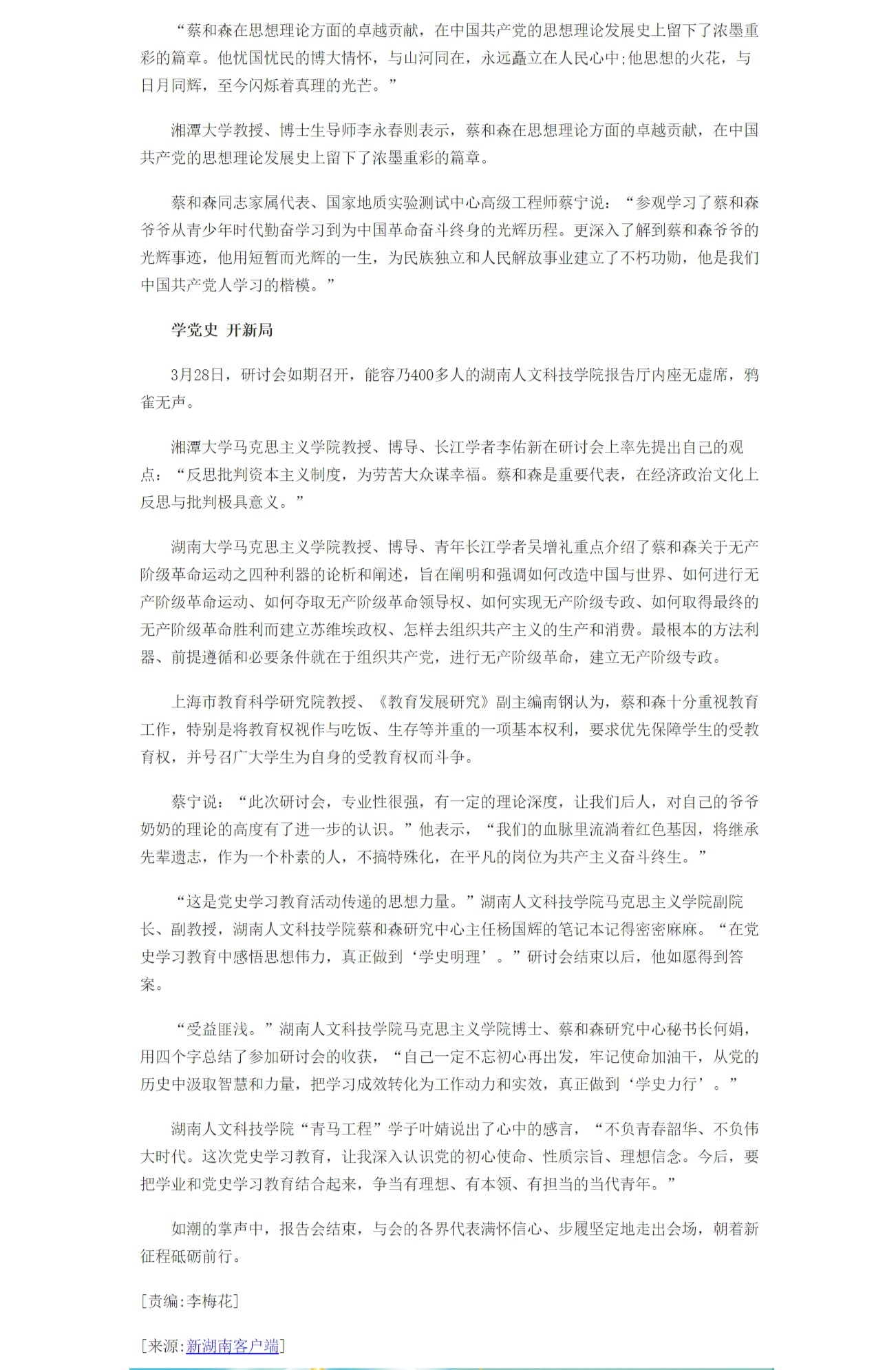 4月1日,湖南日报•新湖南客户端以《重温党史葆活力,砥砺奋进新征程——“蔡和森建党思想暨蔡和森诞辰126周年”学术研讨会侧记》为题再次报道了我院举办“蔡和森建党思想暨蔡和森诞辰126周年”学术研讨会的情况。3月28日,我院在KY.COM匠成楼多功能报告厅举行“蔡和森建党思想暨蔡和森诞辰126周年”学术研讨会。此举引起了湖南日报·新湖南客户端报道的关注,并派出记者进行采访。