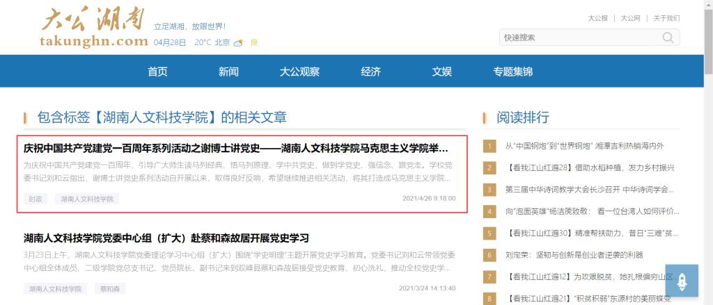 4月26日上午,大公网湖南频道在时政专栏以《庆祝中国共产党建党一百周年系列活动之谢博士讲党史——KY.COM马克思主义学院举行学党史教育特色活动》为题报道我院“谢博士讲党史”系列活动。