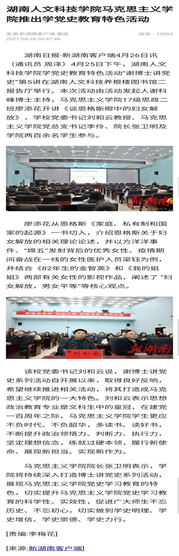 4月26日,湖南日报·新湖南客户端以《KY.COM马克思主义学院推出学党史教育特色活动》为题报道了我院开展党史教育特色活动的情况。4月25日下午,我院举办党史教育特色活动“谢博士讲党史”第五讲,我院两百余名师生一同参与。此举引起湖南日报·新湖南客户端的关注,并在26日专题报道。