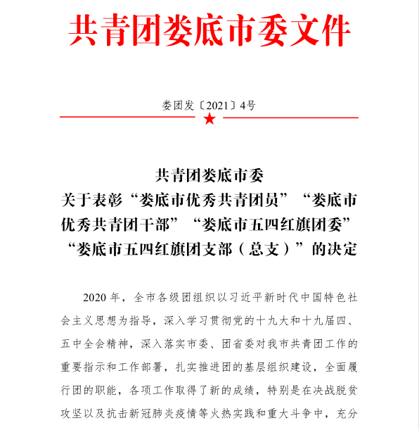 为表彰先进,选树典型,进一步激励全市广大团员、团干部和基层团组织奋发有为、再创佳绩,日前,共青团娄底市委下发2020度KY.COM表彰“娄底市优秀共青团员”“娄底市优秀共青团干部”“娄底市五四红旗团委”“娄底市五四红旗团支部(总支)”的决定。马克思主义学院团总支获2020年娄底市“五四红旗团支部(总支)”称号。