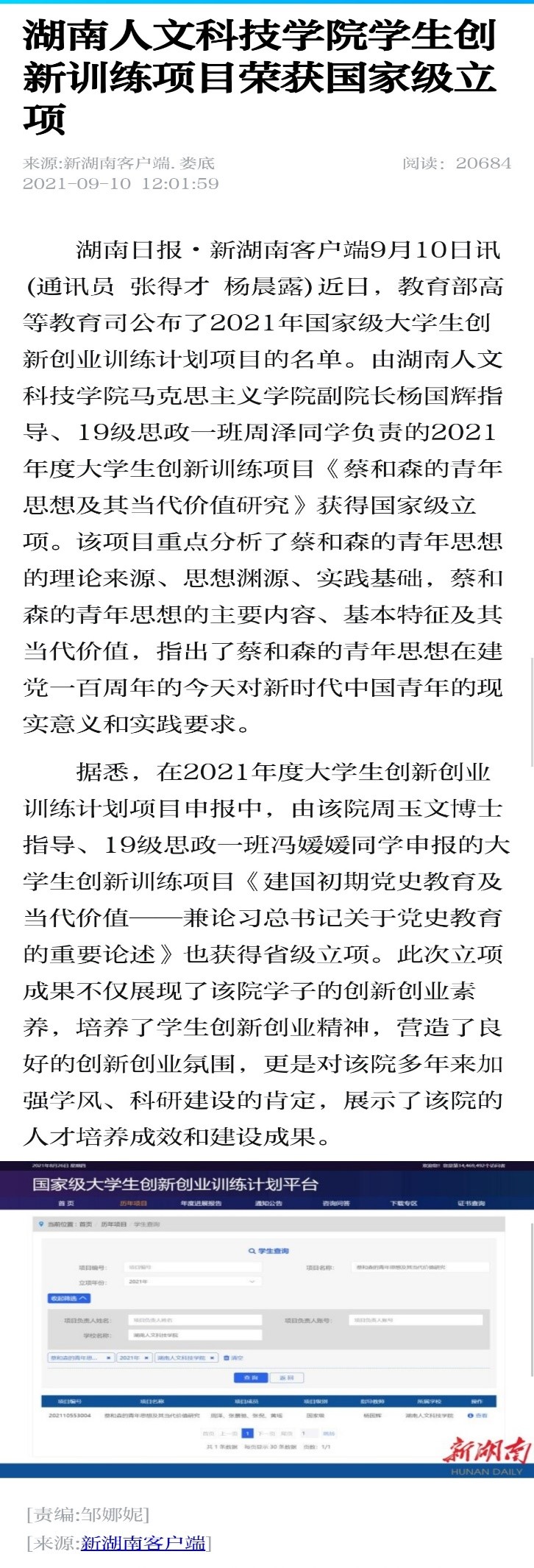 报道指出,由我院副院长杨国辉博士指导、19级思政一班周泽同学负责的2021年度大学生创新训练项目《蔡和森的青年思想及其当代价值研究》获得国家级立项。该项目重点分析了蔡和森的青年思想的理论来源、思想渊源、实践基础,蔡和森的青年思想的主要内容、基本特征及其当代价值,指出了蔡和森的青年思想在建党一百周年的今天对新时代中国青年的现实意义和实践要求。报道还指出,在2021年度大学生创新创业训练计划项目申报中,由我院周玉文博士指导、19级思政一班冯媛媛同学申报的大学生创新训练项目《建国初期党史教育及当代价值——兼论习总书记KY.COM党史教育的重要论述》也获得省级立项。