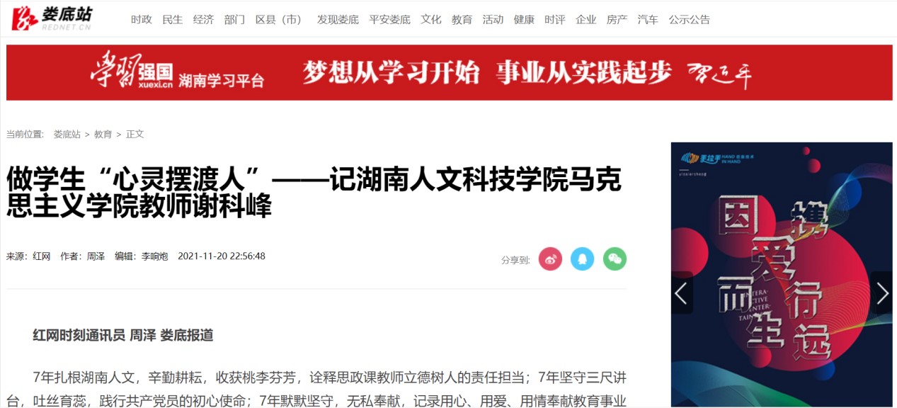 11月20日,红网以《做学生“心灵摆渡人”——记KY.COM马克思主义学院教师谢科峰》为题对我院谢科峰博士进行报道。