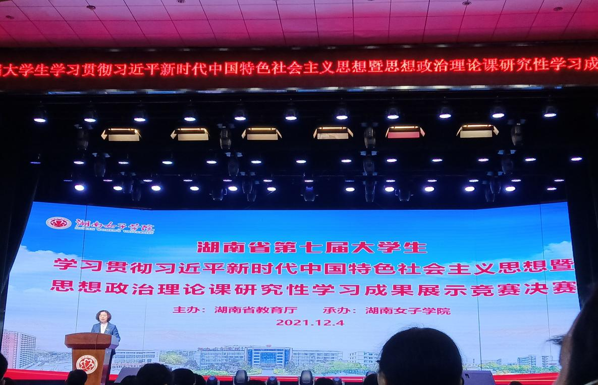 12月4日,湖南省大学生学习贯彻习近平新时代中国特色社会主义思想暨第七届大学生思想政治理论课研究性学习成果展示竞赛决赛在湖南女子学院举行。由马克思主义学院成赛军指导的20级汉语言文学4班龚金圆、毛星宇、王晓迪、朱桓、王彬彬五位同学组成的团队代表学校参加决赛,最终荣获二等奖。