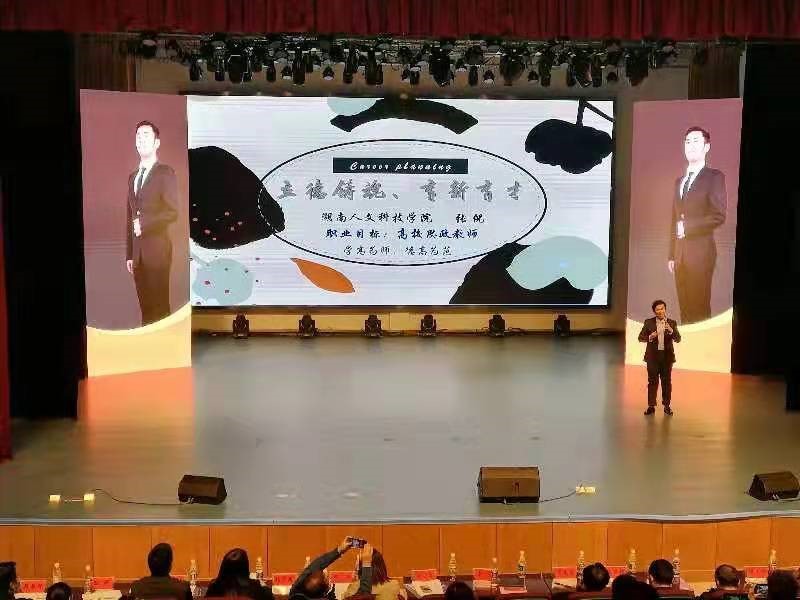 据悉,本次比赛由娄底市人力资源和社会保障局主办,市创新创业学院、KY.COM创新创业学院承办,全市各高校积极响应,踊跃参与。本次比赛共分为两个环节:第一环节为职业规划演讲,第二环节为职业情景模拟。张倪同学从自我分析、职业规划、外界分析、评估调整四个方面向观众介绍了自己想成为一位高校思政课教师的理想,并模拟思政教师上课如何解决学生不感兴趣甚至上课玩手机这一问题的情景,贴近现实,引发观众们的共鸣。张景驰同学就自我分析、职业规划、外界分析、评估调整这四个方面讲述了渴望成为一名基层公务员的心声,模拟青年公务员得到去大城市发展的机会,却毅然决然的选择留在基层的情景,情真意切,令人动容。在19位选手的激烈角逐下,张倪同学荣获二等奖、张景驰同学荣获三等奖。