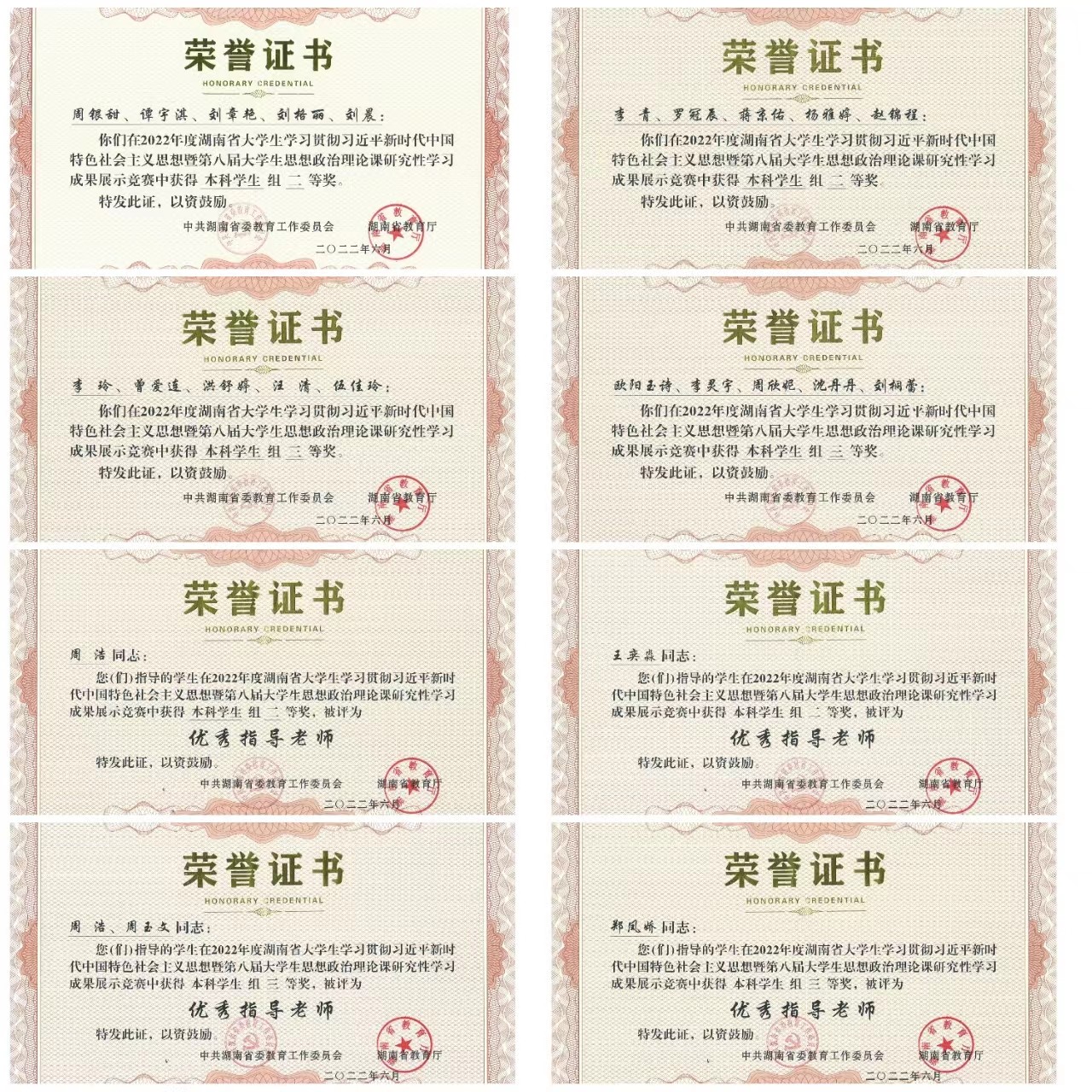 5月28日,湖南省第八届大学生学习贯彻习近平新时代中国特色社会主义思想暨思想政治理论课研究性学习成果展示竞赛决赛在湖南信息学院举行,此次比赛有37所本科高校的9210个研究性学习小组的作品进入复赛,最终16所高校进入决赛,我院取得两个省二等奖、两个省三等奖的佳绩。我院指导老师周浩、周玉文、王奕淼、郑凤娇荣获优秀指导老师。