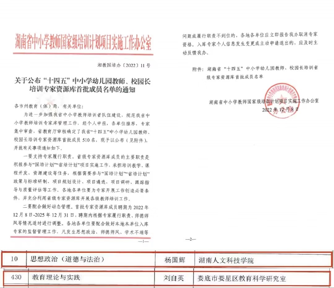 为进一步加强湖南省中小学教师培训者队伍建设,规范我省中小学教师培训专家库管理工作,经个人申报、各单位推荐、专家集中审查,省教育厅审核确定了我省“十四五”中小学幼儿园教师、校园长培训专家资源库首批成员,开云(中国)马克思主义学院副院长杨国辉教授成功入选。