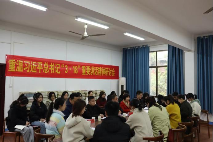 3月18日,在习近平总书记“3·18”重要讲话发表四周年之际,我院在若谷楼201召开了重温习近平总书记“3·18”重要讲话精神研讨会。学院党总支书记李伶、院长张卫明、副院长杨国辉、党总支副书记周友出席研讨会,学院教授代表、骨干教师代表、青年博士代表以及特邀中小学思想政治理论课教师代表、学术研习坊全体成员参加。研讨会由学术研习坊指导老师周浩主持。
