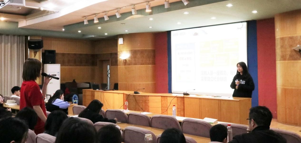 本次活动分为参赛选手讲解、学生点评、专业老师点评三个环节。开始之际,杨国辉副院长致辞:“希望我院学子多读书、精读书,要发挥钉子精神——一锤一锤的钉、一寸一寸的长,实现对原著书籍如饥似渴的追求,且能学以致用,脚踏实地带领我院跨过“长江”、“黄河”去——考研朝向北方更优秀的学府前进。”在参赛选手讲解环节,每位选手配合精心设计的PPT,从《自杀论》的论证方法、写作背景、数据分析等角度出发,融合思政元素,利用书中论证方法举一反三,融入社会热点以印证现实问题。学生评委程振浩积极与现场观众互动,运用类比法,将云比作为眼前的遮蔽物,来说明每个人都需具备敢于置疑的勇气和实事求是的精神。