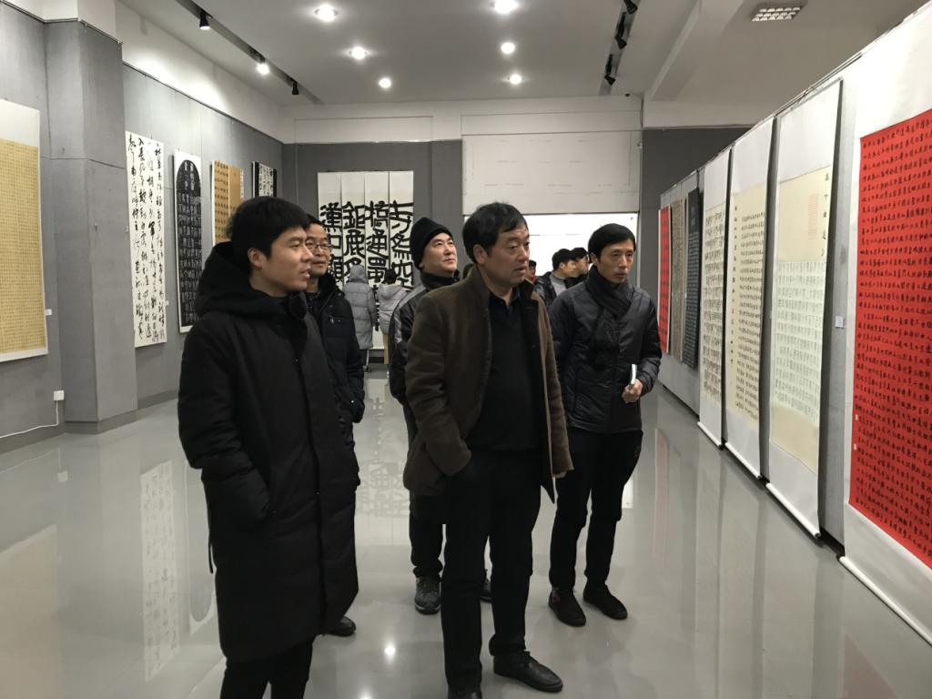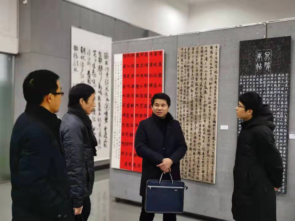美设学院党政主要领导谢光绎、陆序彦、易俊及书法专业师生陪同或自行参观展览。(书法学教研室供稿)