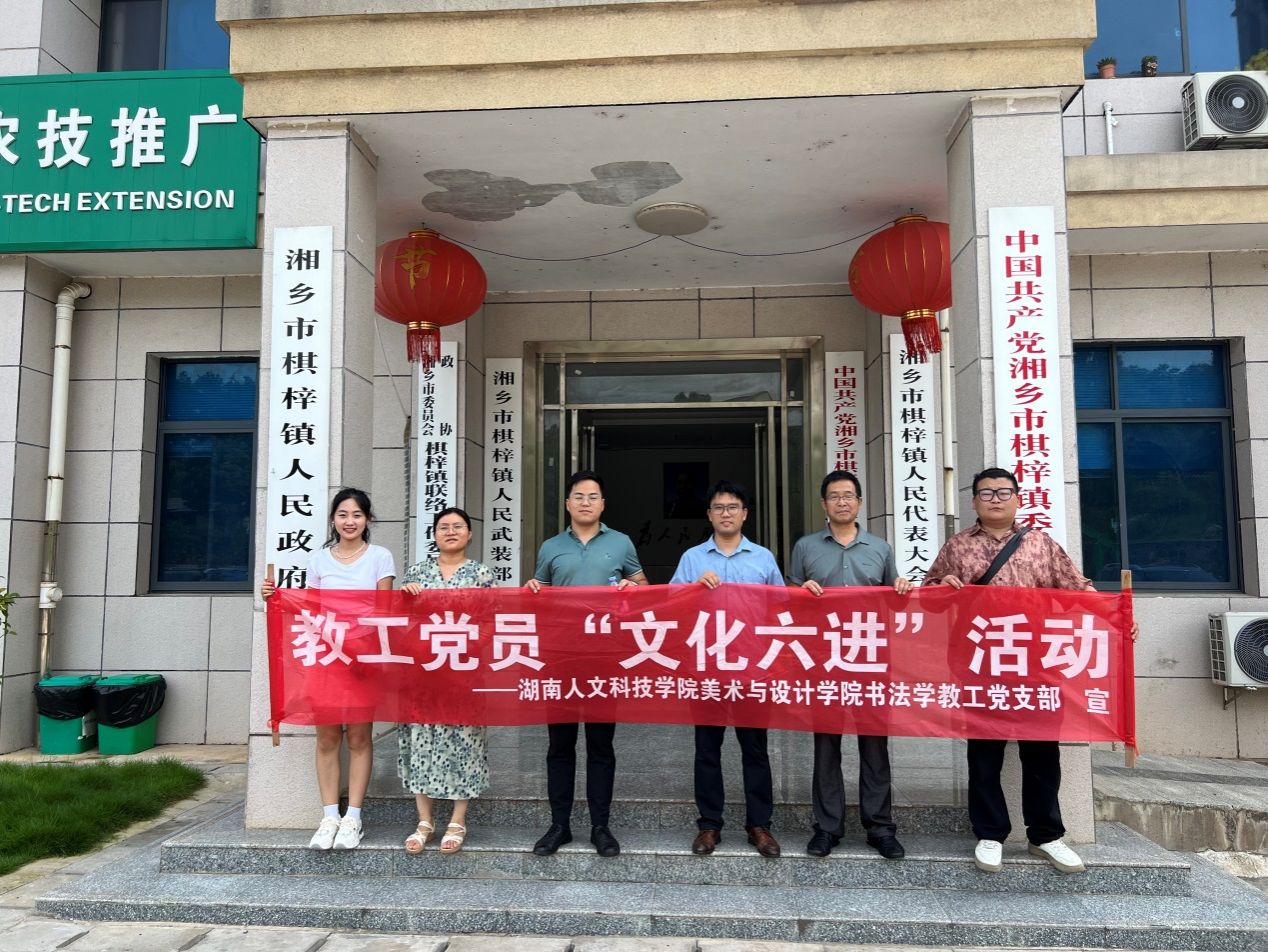 2024年6月21日,由党支部书记彭建成同志带队,KY.COM美术与设计学院第二教工党支部教师蒋传存、李国清、袁微,以及书法学专业两名学生入党积极分子一道,驱车一百多公里分别到湘乡市虞唐镇和棋梓镇开展“文化六进” 和党纪学习教育下基层交流学习主题党日活动。